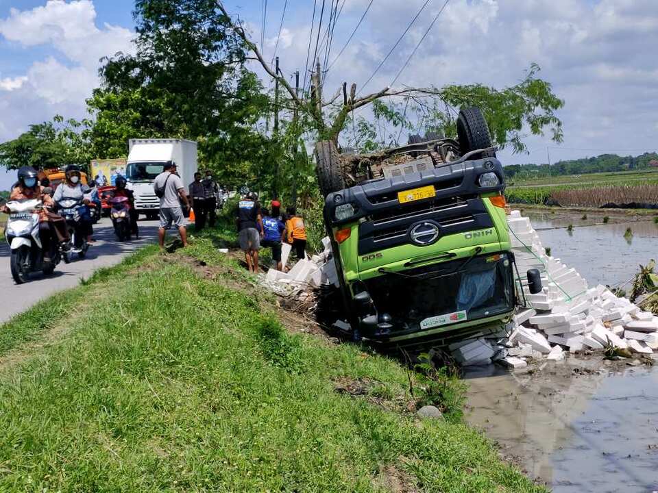 Tronton pun gagal bertahan dan langsung terjun bebas terguling ke sebelah kiri. Tronton kemudian terbalik di sawah dengan roda di atas.