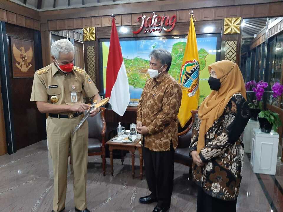 SEMARANG, JOGLOSEMARNEWS.COM —Gubernur Jawa Tengah, Ganjar Pranowo mendapatkan anugerah sebilah keris dari tokoh budaya asal Solo, Sabar Narimo. Pemberian keris itu disampaikan Sabar Narimo sendiri kepada Ganjar di Kantor Gubernur, Semarang, Senin (13/12/2021).