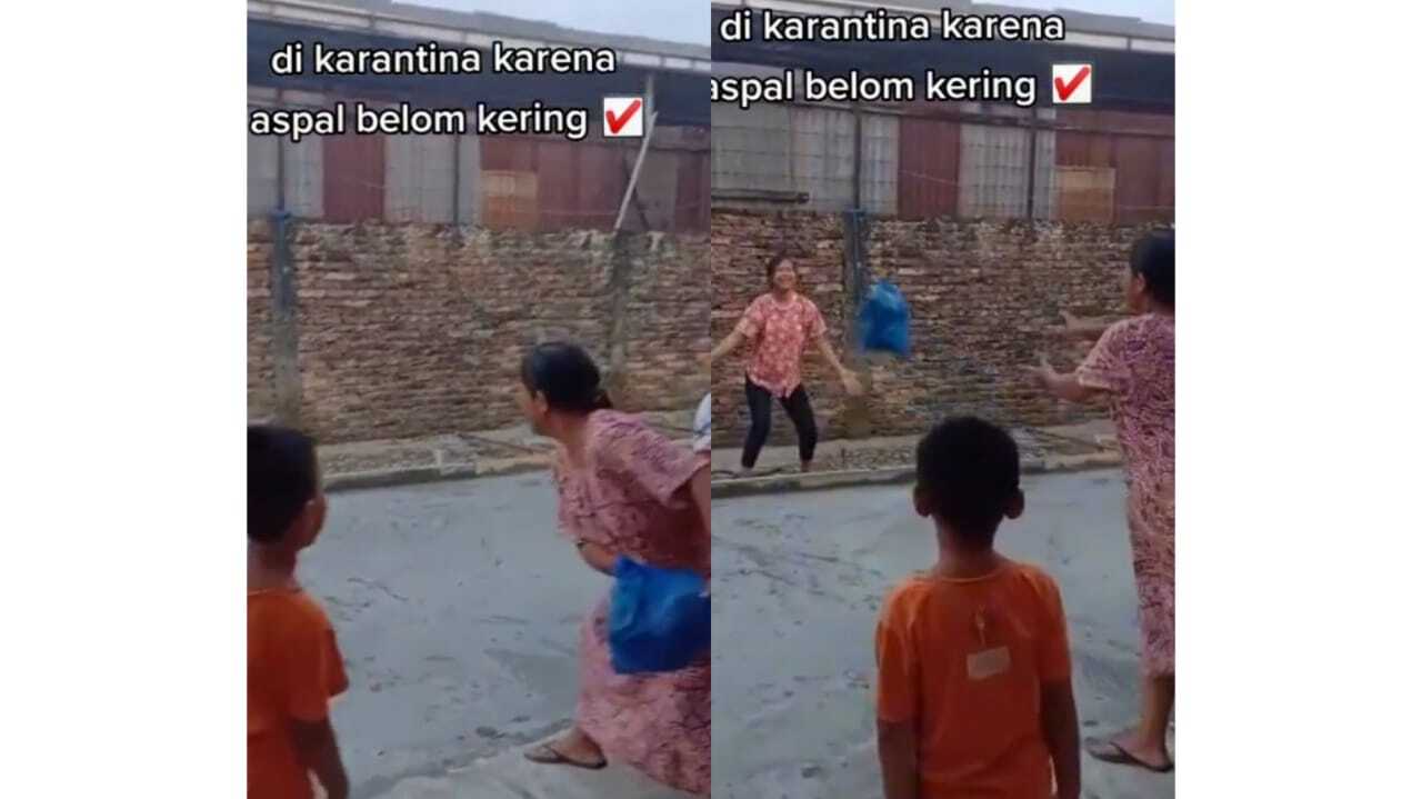 Kocaknya, video berdurasi 14 detik itu merekam aksi emak-emak yang terlihat melemparkan sesuatu ke arah tetangganya. Wanita berdaster itu melemparkan satu plastik kepada tetangganya di seberang jalan.