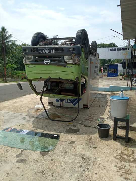 Ngeri lagi truk tersebut terhenti pada posisi terjungkir, yakni ban berada di atas.