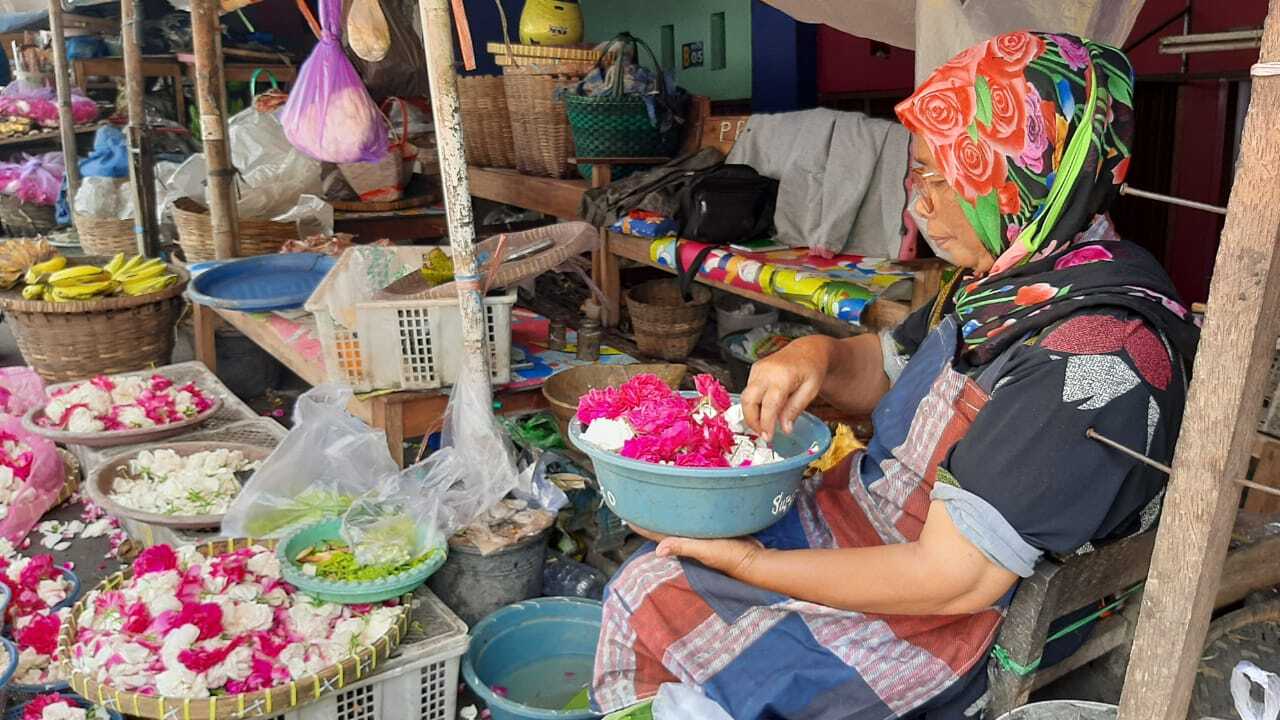 Di Pasar Boyolali Kota, penjual kembang tabur terlihat berjejer di sepanjang trotoar. Bahkan ada pula beberapa penjual mawar dadakan.