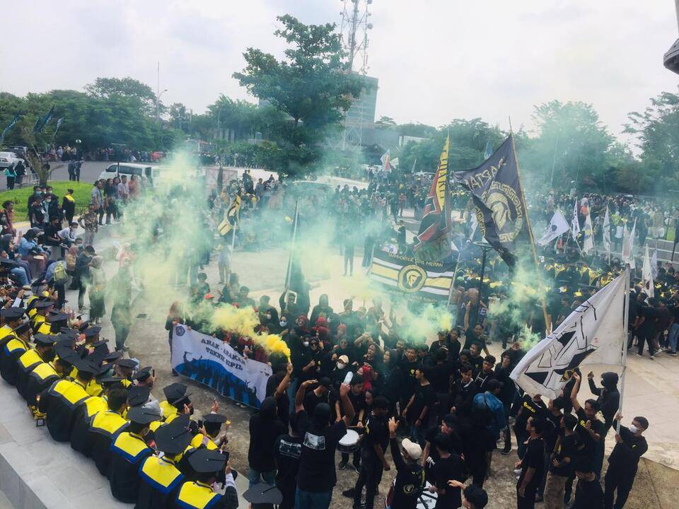 Para wisudawan diarak dan dikumpulkan di depan Edutorium UMS dan bernyanyi yel-yel bersama sebagai bentuk solidaritas.