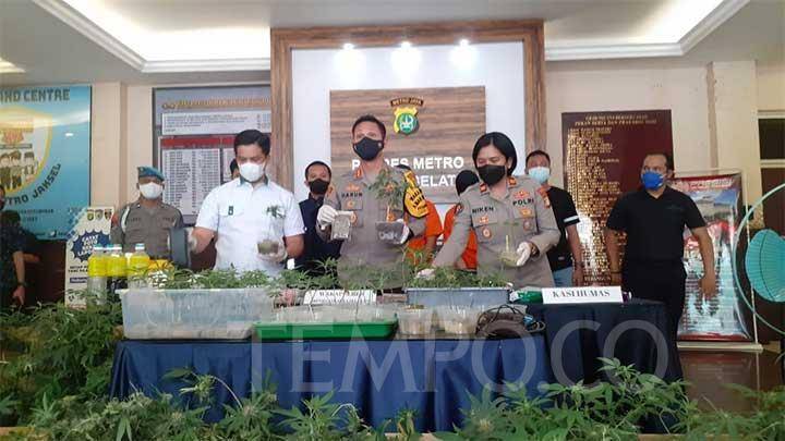 Pada konferensi pers tersebut, Polisi berhasil menunjukkan barang bukti berupa puluhan tanaman ganja berusia mingguan hingga bulanan.