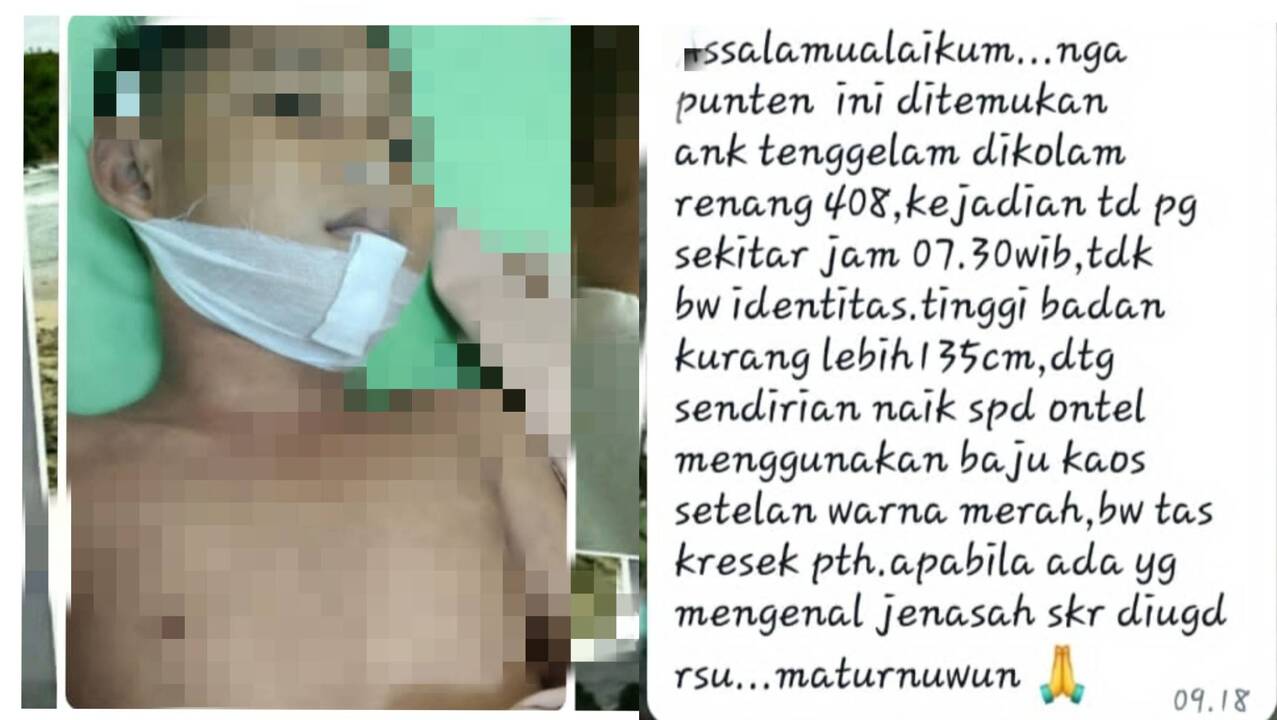 “Assalamualaikum…ngapunten ibu2 ini ditemukan ank tenggelam dikolam renang 408,tdk bw identitas.tinggi badan kurang lebih135cm.apabila ada yg mengenal jenasah skr diugd rsu…maturnuwun”,” sebut informasi di WA grup. Wardoyo