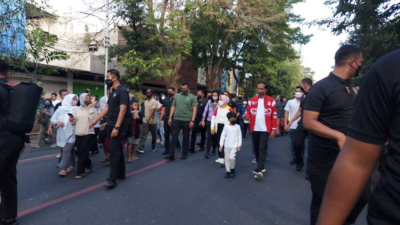 SOLO, JOGLOSEMARNEWS.COM —Presiden Joko Widodo (Jokowi), didampingi cucunya, Jan Ethes serta Ibu negara Iriana Jokowi berolahraga jalan kaki di kawasan Car free day Solo, Minggu (7/8/2022).