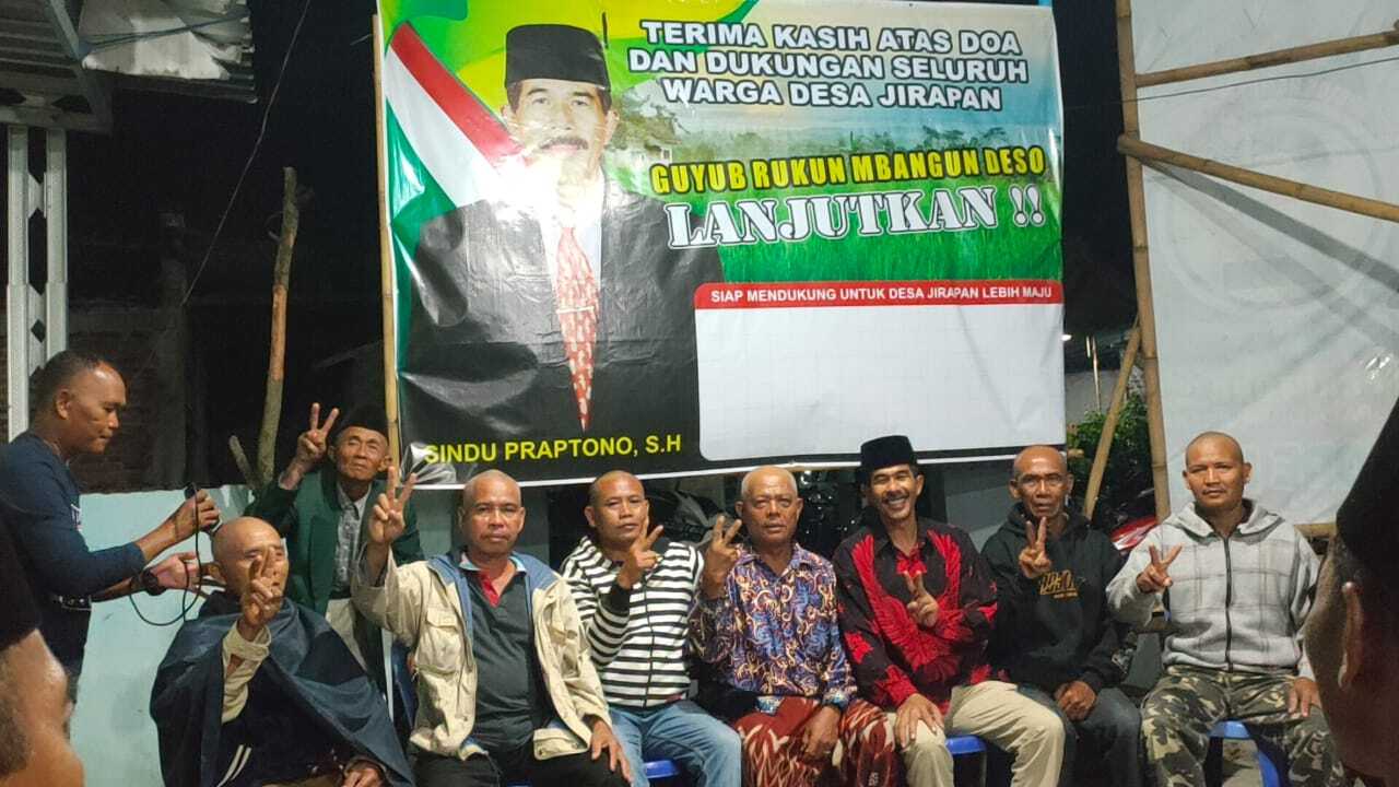 Warga Desa Jirapan pendukung petahana atau incumbent, Sindu Praptono berpose bersama dengan penampilan gundul sebagai wujud syukur calonnya kembali memenangi Pilkades, Selasa (25/10/2022). Foto/Wardoyo