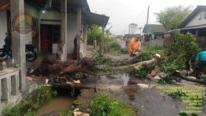 SLEMAN, JOGLOSEMARNEWS.COM – Hujan yang cukup ekstrem disertai dengan angin kencang yang melanda Kabupaten Sleman, menumbangkan sejumlah pohon besar pada Selasa (13/12/2022).