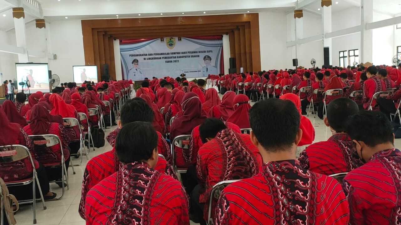 Ada yang menarik dari prosesi pengangkatan PNS tersebut. Tak seperti biasanya yang mengenakan pakaian putih hitam, kali ini semua CPNS yang diangkat, mengenakan seragam batik Pemkab yakni parang sukowati.