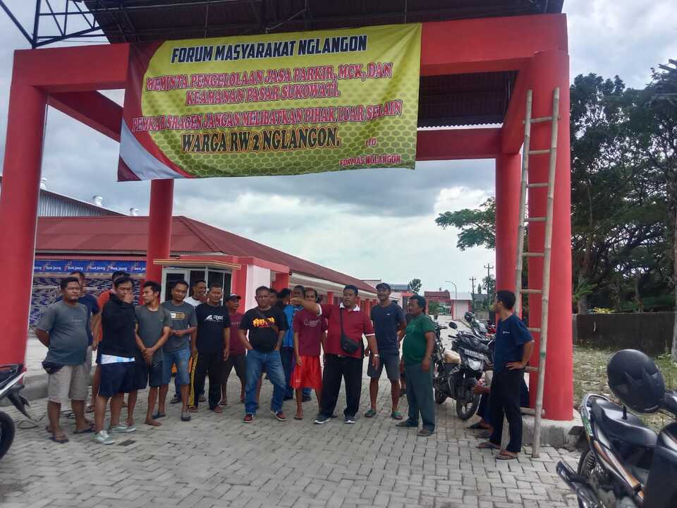 “Forum masyarakat nglangon, meminta pengelolaan jasa parkir, MCK, dan keamanan pasar Sukowati. Pemkab Sragen jangan melibatkan pihak luar selain warga Rw 2 Nglangon, TTD Formas Nglangon,”.