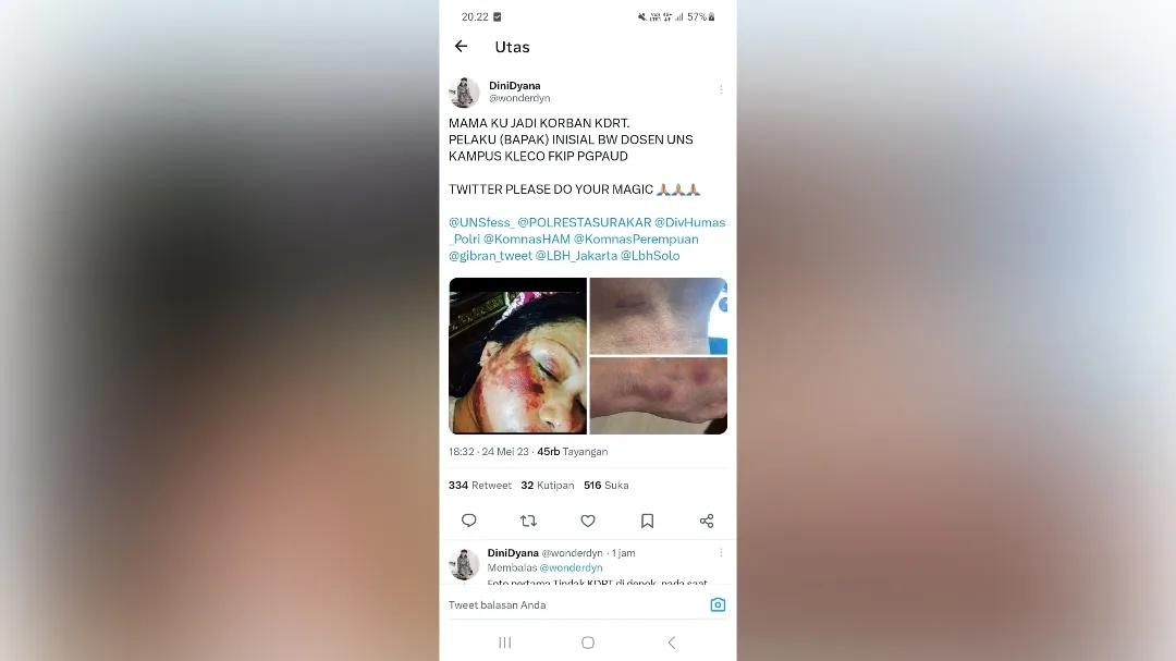 “Foto pertama tindak KDRT di Depok, pada saat bapak ku masih bekerja di KEMENDIKBUD. foto kedua dan ketiga Tindak KDRT di lingkungan UNS kampus Kleco,” tulis akun @wonderdyn Rabu (24/5/2023).