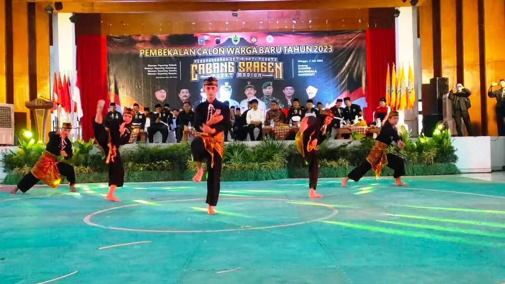 Peragaan seni bela diri PSHT Cabang Sragen pusat madiun saat momen pembekalan calon warga baru PSHT 2023