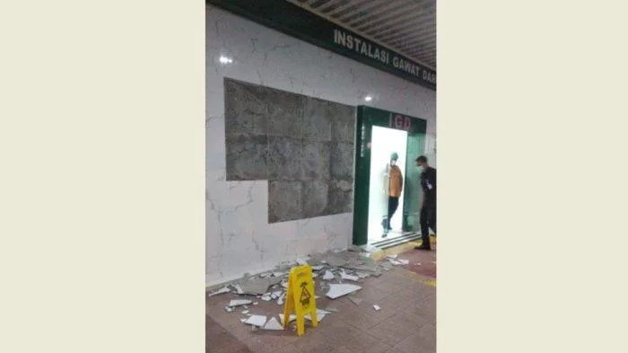 Usai gempa terjadi, beberapa dinding keramik bagian luar Instalasi Gawat Darurat (IGD) rumah sakit tersebut lepas dan rontok pada Jumat (30/6/2023) malam.