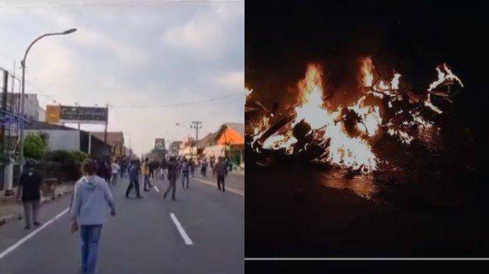 Massa saling melempar batu hingga membakar sepeda motor di tengah jalan.
