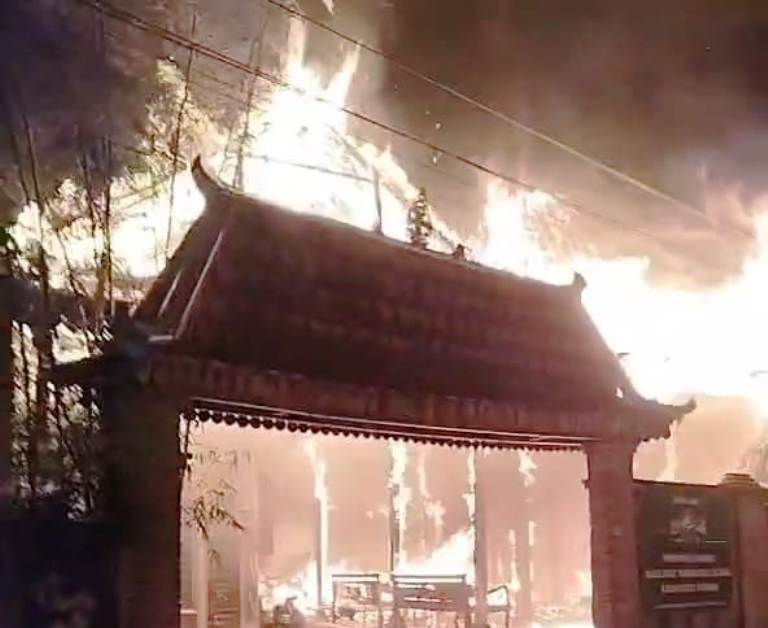 Musibah kebakaran rumah anggota DPRD Sragen di Kampung Krapyak, Kelurahan Sragen Wetan, Kecamatan Sragen kota, Kabupaten Sragen, Jawa Tengah terlihat api menghanguskan seluruh bangunan rumah.