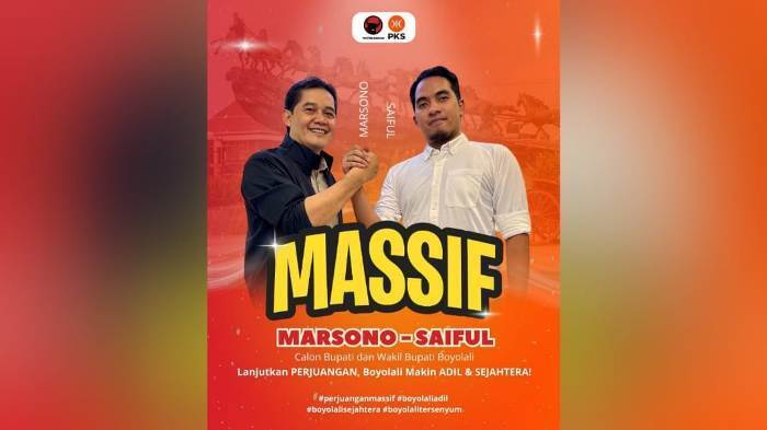 BOYOLALI, JOGLOSEMARNEWS.COM – DPP PDIP resmi merekomendasikan paslon Marsono-Saifulhaq Mayyazi dalam Pilkada Boyolali 2024. Pengumuman itu disampaikan DPP PDIP, Senin (26/8/2024).