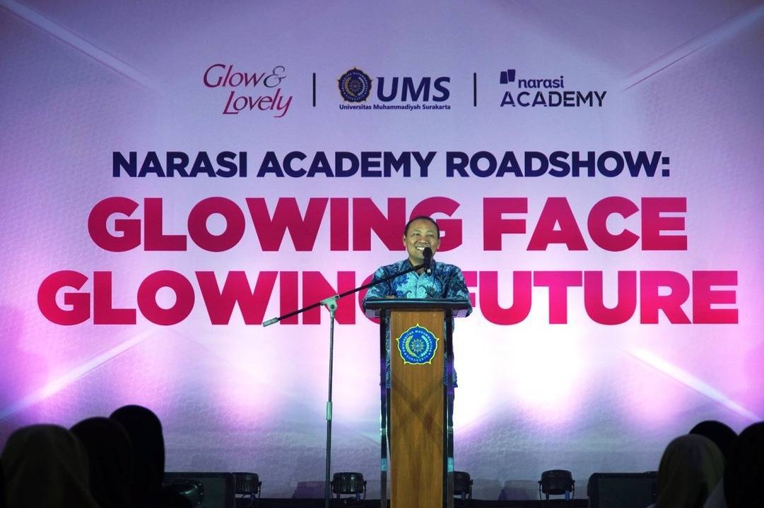 SOLO, JOGLOSEMARNEWS.COM — Narasi Academy melanjutkan roadshow bersama dengan Glow & Lovely dan Universitas Muhammadiyah Surakarta (UMS) dengan tema ‘Glowing Face Glowing Future’ yang diadakan di Auditorium Mohammad Djazman UMS, Kamis (10/10).