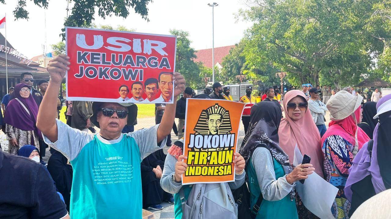 Dalam aksinya mereka membawa poster dengan tulisan ‘adili Jokowi’,’usir keluarga Jokowi’,’ganyang fufufafa’.