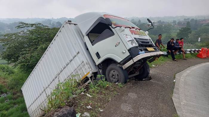 Posisi truk boks dengan nomor polisi B- 9578-UVZ berada di bibir jalan. Di bawahnya adalah ladang warga dengan kedalaman sekira enam meter.