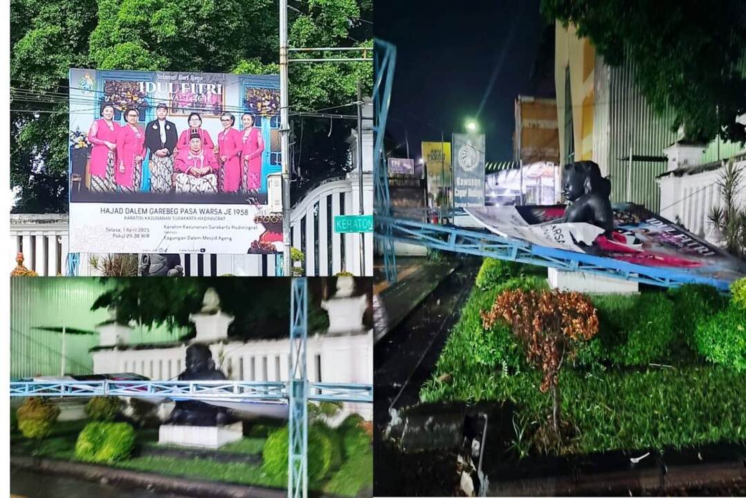 SOLO, JOGLOSEMARNEWS.COM — Baliho yang memuat foto Pakubuwono XIII dan keluarga Keraton Kasunanan di Gladak tiba-tiba roboh. Usai terkena hujan angin yang terjadi pada Kamis, (03/04/2025) sore.