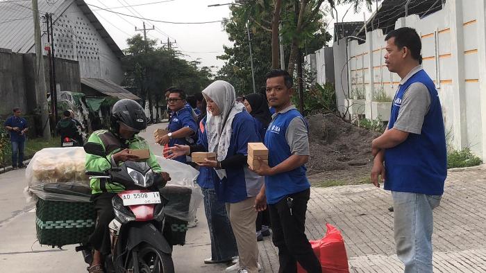 Pembagian takjil dipusatkan di depan kantor CV Sentral Klatindo Abadi yang berada di Jalan Raya Delanggu, Klaten, mulai pukul 16.00 WIB. Puluhan karyawan tampak kompak mengenakan seragam biru dan turun langsung membagikan paket berbuka puasa kepada para pengendara dan warga yang melintas.