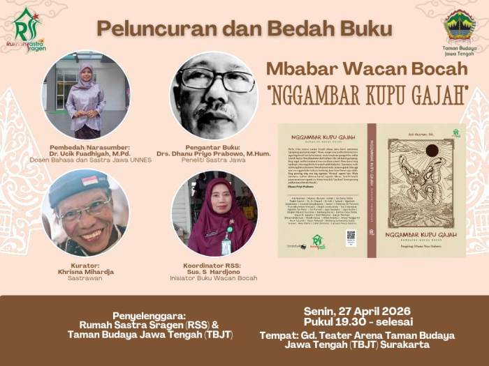 SOLO, JOGLOSEMARNEWS.COM – Upaya menanamkan nilai karakter dan jati diri bangsa kepada anak-anak terus digelorakan melalui dunia literasi. Salah satunya diwujudkan lewat peluncuran buku cerita anak berbahasa Jawa (wacan bocah) berjudul Nggambar Kupu Gajah yang digelar di Taman Budaya Jawa Tengah (TBJT) Surakarta, Senin (27/4/2026) malam.