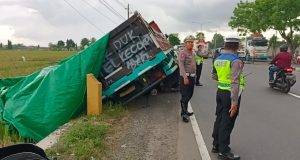 Terlena Jalanan Licin, Truk AD BY Terguling dan Terbalik di Dekat...